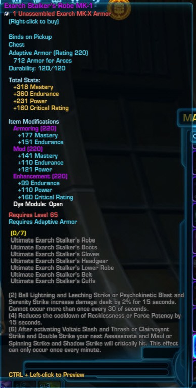TOR Fashion was a website that also catalogued SWTOR armor, and was passed down to me. These are the images that were on the site for the Exarch Force-Master / Force-Mystic / Stalker / Survivor MK-1 set.