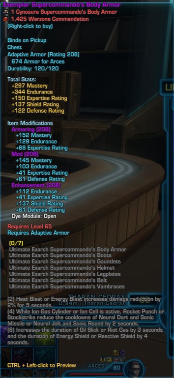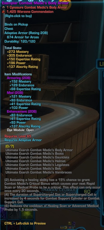 TOR Fashion was a website that also catalogued SWTOR armor, and was passed down to me. These are the images that were on the site for the Exemplar Combat Medic / Combat Tech / Eliminator / Supercommando set.
