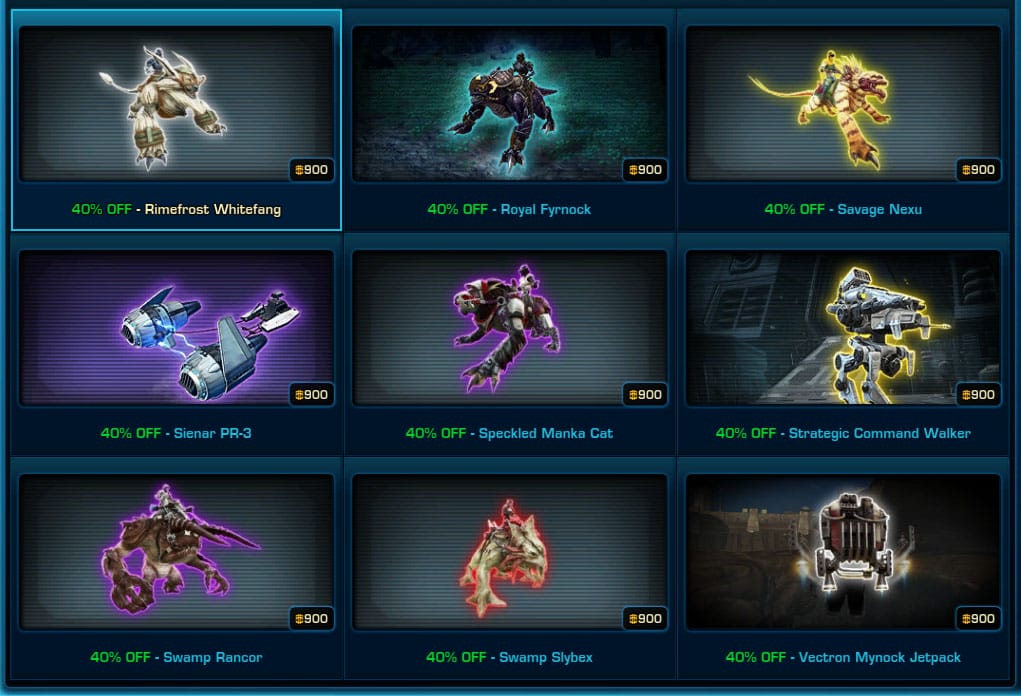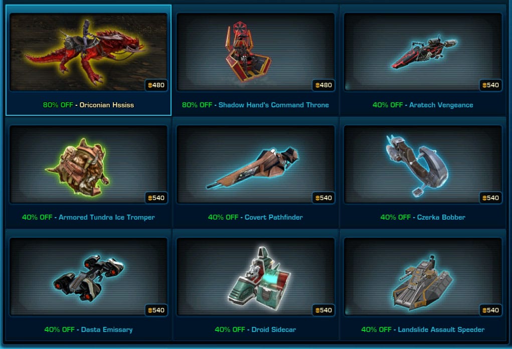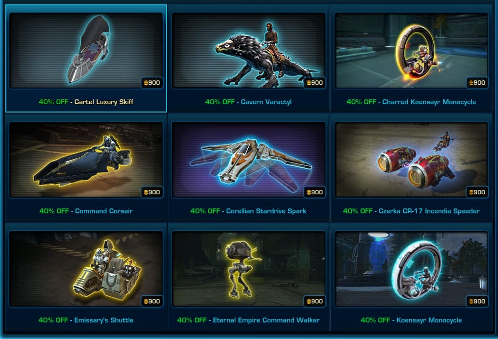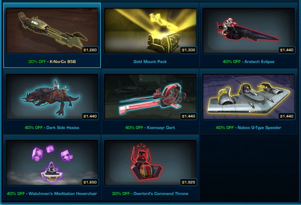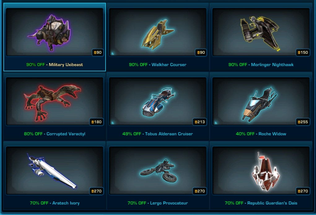 The SWTOR Summer Sale for mounts has begun! Beginning July 30, 2025, there will be a variety of category sales on the Cartel Market ranging between 30-90% off. Below is the current category sales schedule: