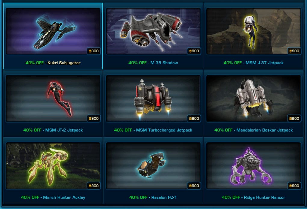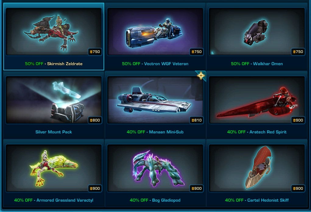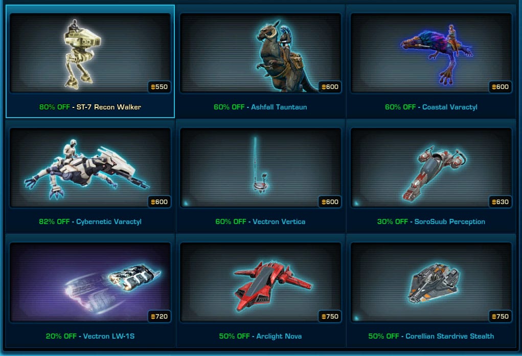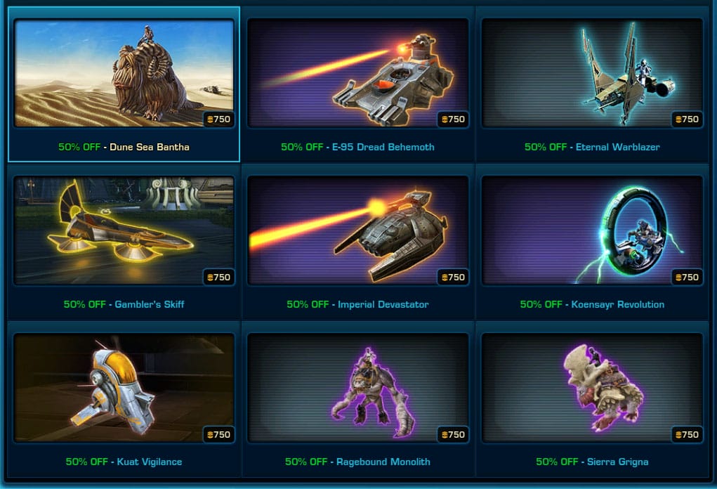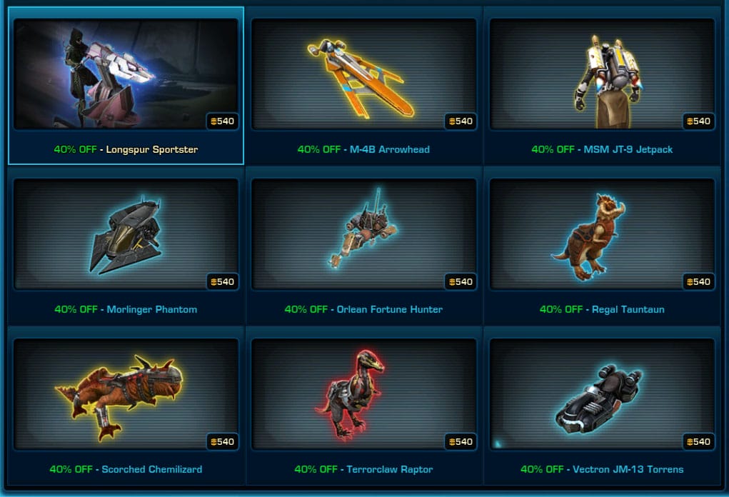 The SWTOR Summer Sale for mounts has begun! Beginning July 30, 2025, there will be a variety of category sales on the Cartel Market ranging between 30-90% off. Below is the current category sales schedule:
