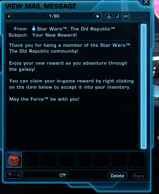 Some players are also/or reporting they got a B1-SAL Probe Droid for being a “member of the SWTOR community”. This was a bug.