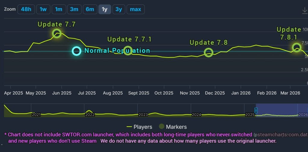 2026 previous year: The update cadence of the game isn’t as frequent as most long-time players would want it, but the game is by no means dead either – the most recent expansion brought a huge overhaul to many of the game’s systems that really points towards the development team investing in the game’s infrastructure and future. In the past few years, the development team has made a ton of technical changes to the game – the servers have been moved to Cloud Servers, a new Asia-Pacific server has opened, the game is now 64-bit, there is new cinematic lighting across the entire game, many plants got visual graphical re-hauls, the GTN an economy was revamped, and a MAC launcher was added to the game. In addition to the story updates, there’s also a newer type of content called Galactic Seasons and PvP Seasons, so there’s always something new to do in-game.