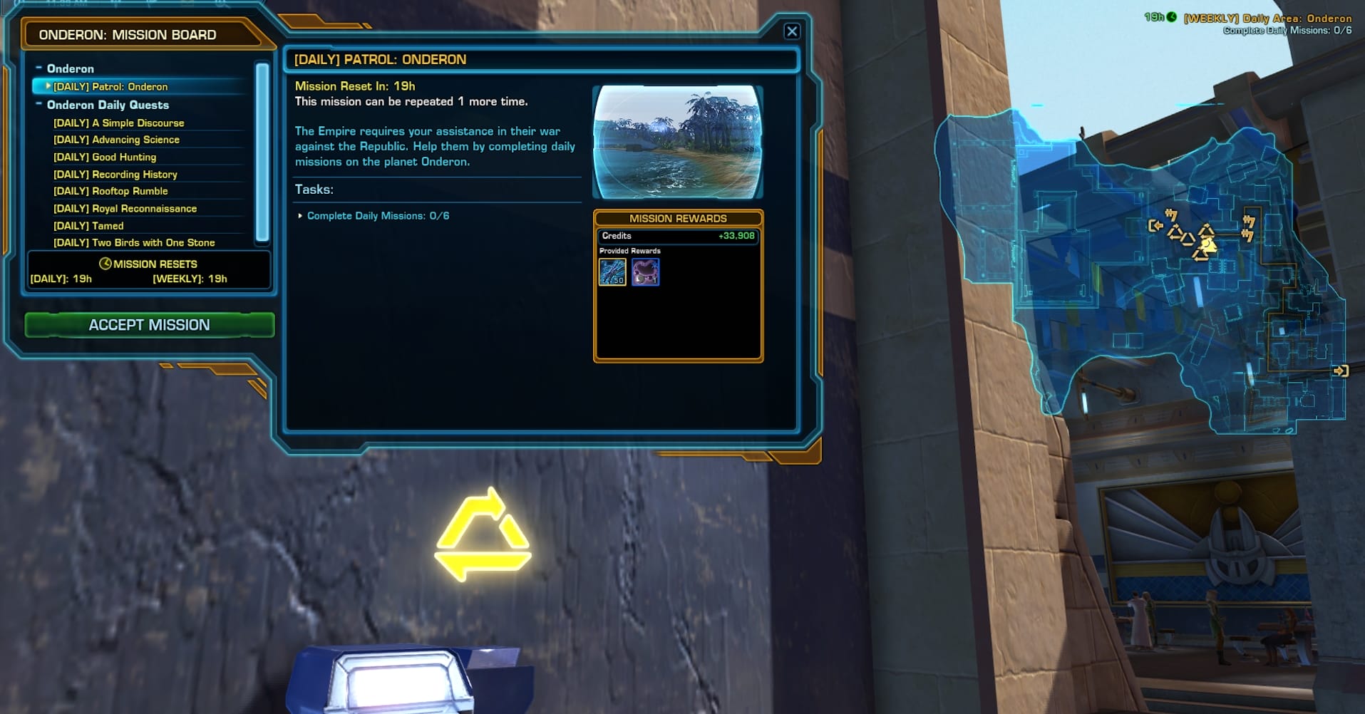 The Onderon dailies are a set of missions you can repeat to earn Reputation and Rewards. Ossus is the first daily area of Onslaught, the first expansion after the Jedi Under Siege update. It takes place after Ossus and before Mek-Sha.