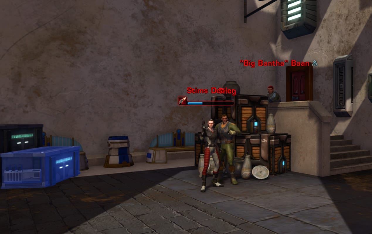 - Inside you’ll immediately see enemies on your left and right in the alleys. The image above has all you need to know – thugs are generic enemies, stim dealers will cast heals so interrupt them or kill them first, and the ends of the alleys will have the named enemies to take out for the mission.
