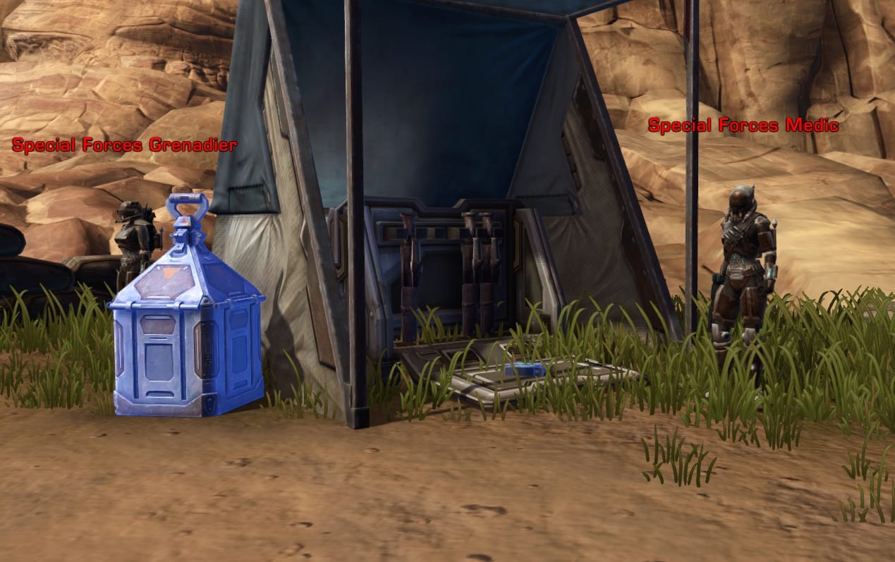 - Every mandalorian enemy (like the ones pictured) will have a chance to drop armor. If you’re looking for a bonus, “eliminate the supplies” requires you to interact with and destroy 6 boxes laying around the complex. They’re mostly indoors or right up against the tents.