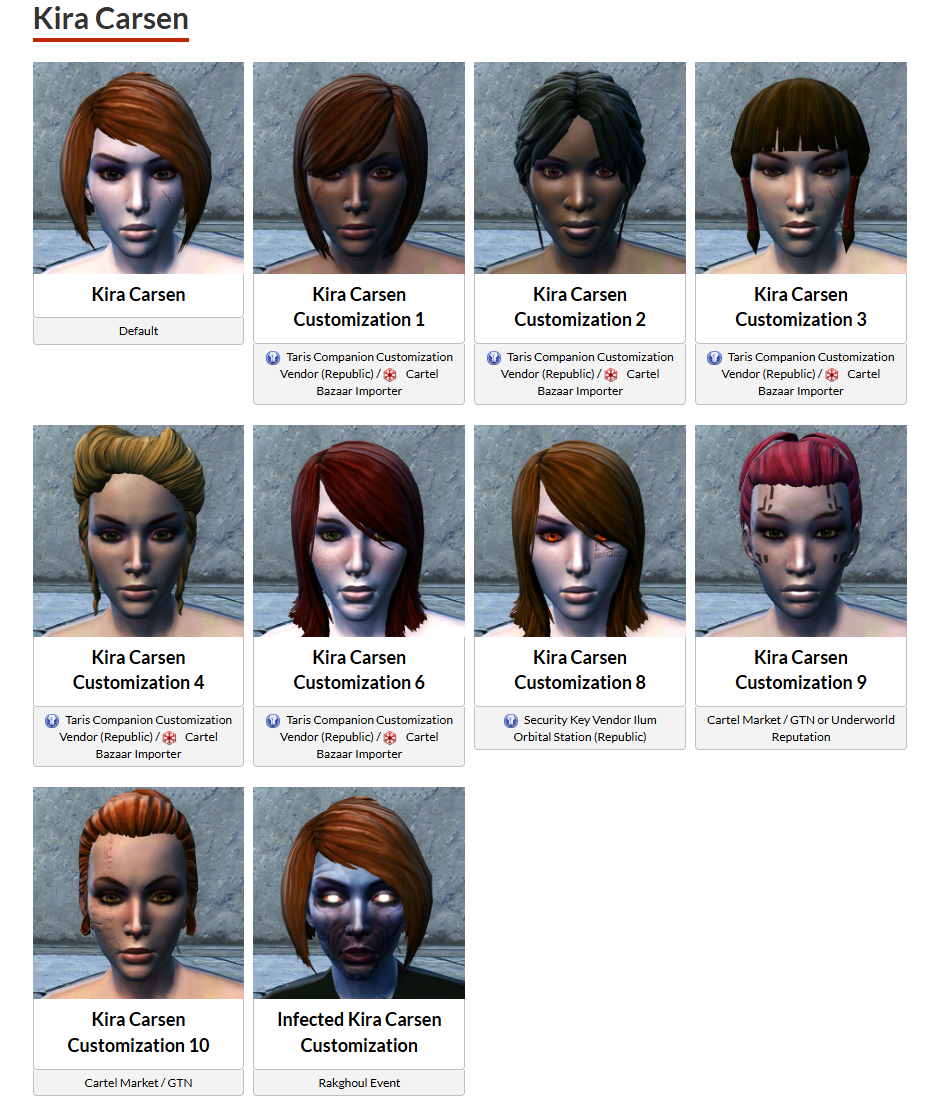 For example, Kira, a Jedi Knight companion, has her default look, 5 looks you can pick up either through questing or from vendors on different planets, one customization you can get for using a security key, two customizations from the cartel market, and one special weird customization from the Rakghoul Event.