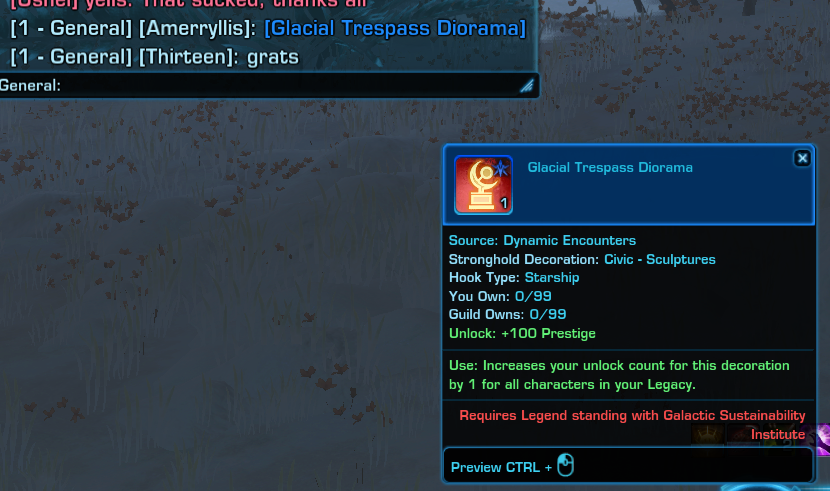 ![]() | Research Notes: Glacial Trespass | Allows interactions with special objects in Glacial Trespass for 30 minutes - Research notes containing information collected on the Glacial Trespass by the Galactic Sustainability Institute. | Friend | 35,000 |
