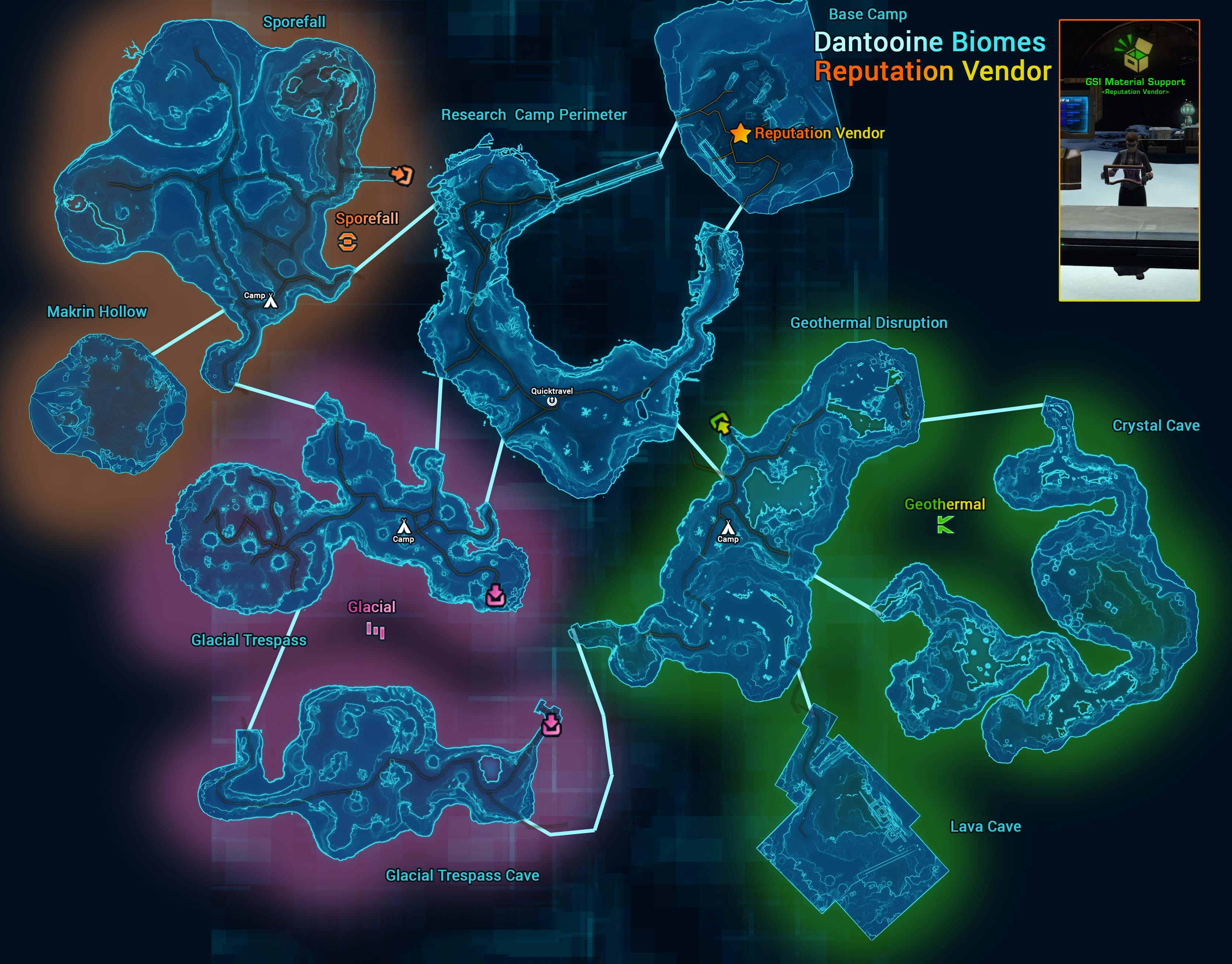 Dantooine Biomes are a set of Dynamic Encounters quests in the Crashed Ship Zone area of Dantooine. This area is designed for level 80 characters, and is a set of explorational quests exploring the three unique biomes each with their own hazardous and repeatable encounters. This area also has its own Reputation track and set of rewards and achievements.