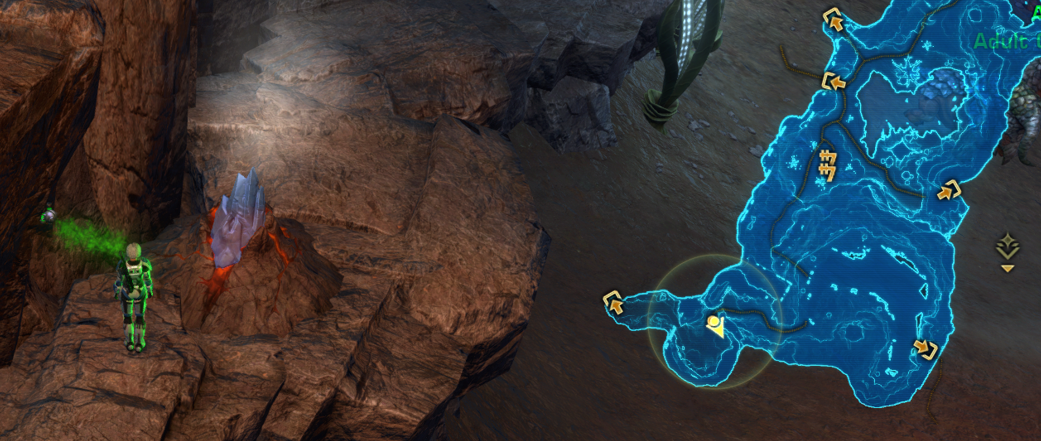 - Crossover Buffs – Glowing blue objects you can right-click that are not a part of the Dynamic Encounter objectives – they look like small lava vents or spore flowers from a specific location after a transition, and give you a small combat boost lasting 30 minutes or until death