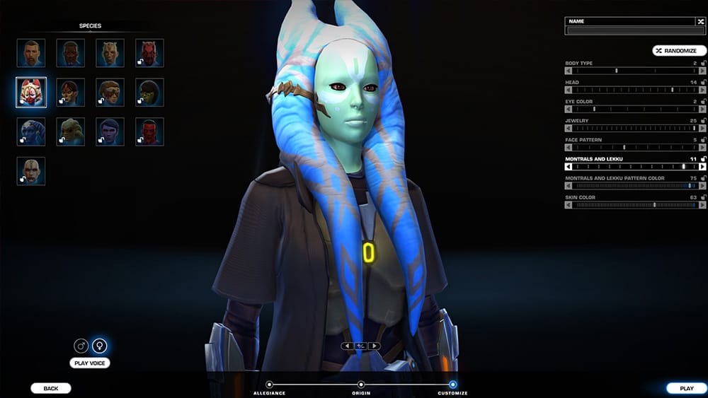 To unlock additional species, for example to play a Pureblood Sith as a Jedi Knight, players will need to unlock that species through legacy or through an item unlock. Additional species unlocks cost 600 CC, or 1,500,000 credits and any level 50 character (subscribers only), or requires you to level 50 on one of the above listed combinations for that species (subscription required to create the character without the unlock, but you do not need to maintain the subscription after). Togruta, Cathar and Nautolan all require a Cartel Market 600 CC unlock and can not be unlocked the normal ways. |
