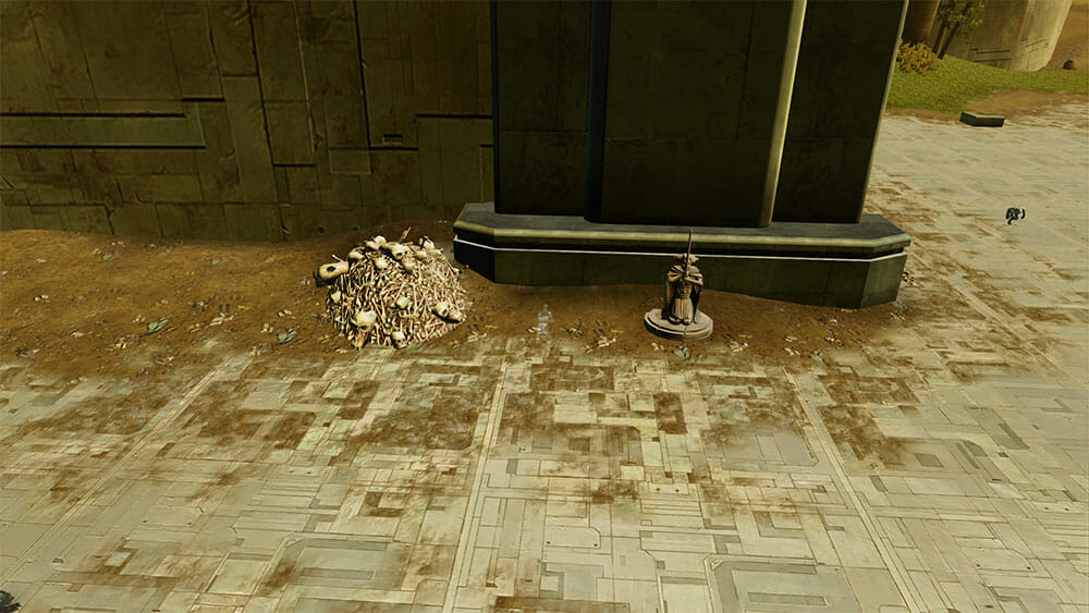 Start from Kanner Outpost and head north into the sinking city’s sliding plate. Next to a large wall is a pile of bones. The lore object is a kneeling Jedi statue next to it.