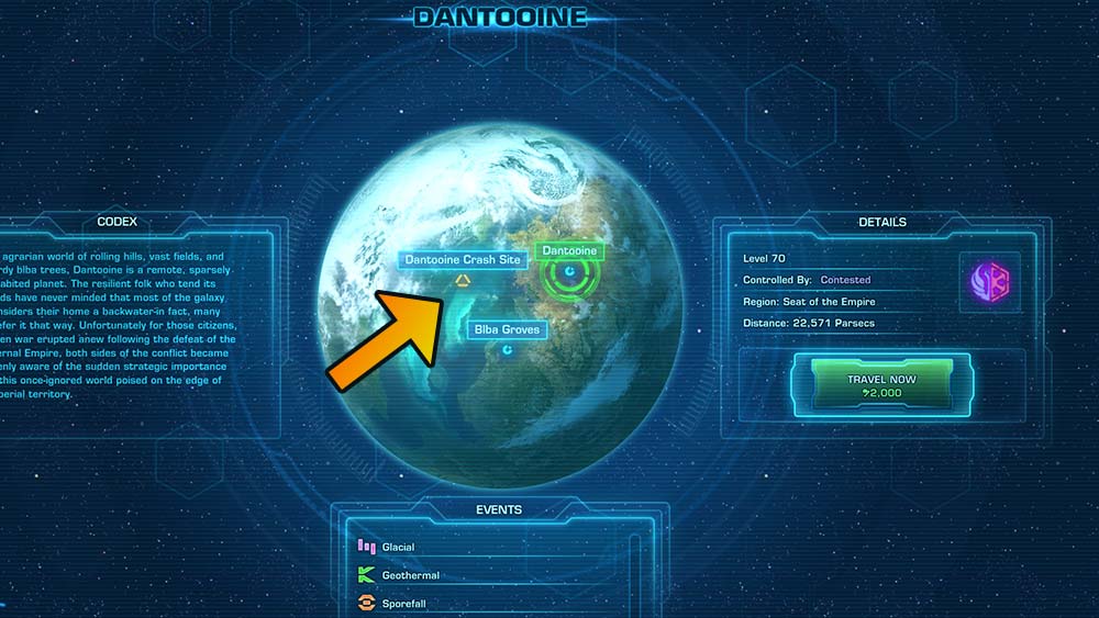 Wreckage on Dantooine is the main quest line for the Dantooine Crash Site and Dantooine Biome Dynamic Encounters area, which teaches you about the unique hazards of the crash site, and gives you a tour of the area. You will need to be level 80 for this quest.
