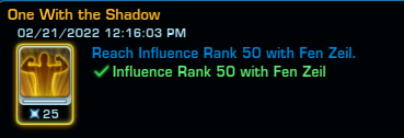 | Detailed Intelligence Reports | Special - Shadow | 5 | artifact | Available from the Galactic Seasons Vendor for 355,000 Credits if you have already reached Influence Level 50 with Fen Zeil on any character on your server. Give this gift to Fen Zeil to instantly increase your influence with him by 15,000. This gift is exclusive to Fen Zeil. This gift does not benefit from the Legacy of Promptness Character Perk or the Legacy of Altruism Character Perk, and will not contribute towards the Companion: Benefactor Conquest Objective. | |