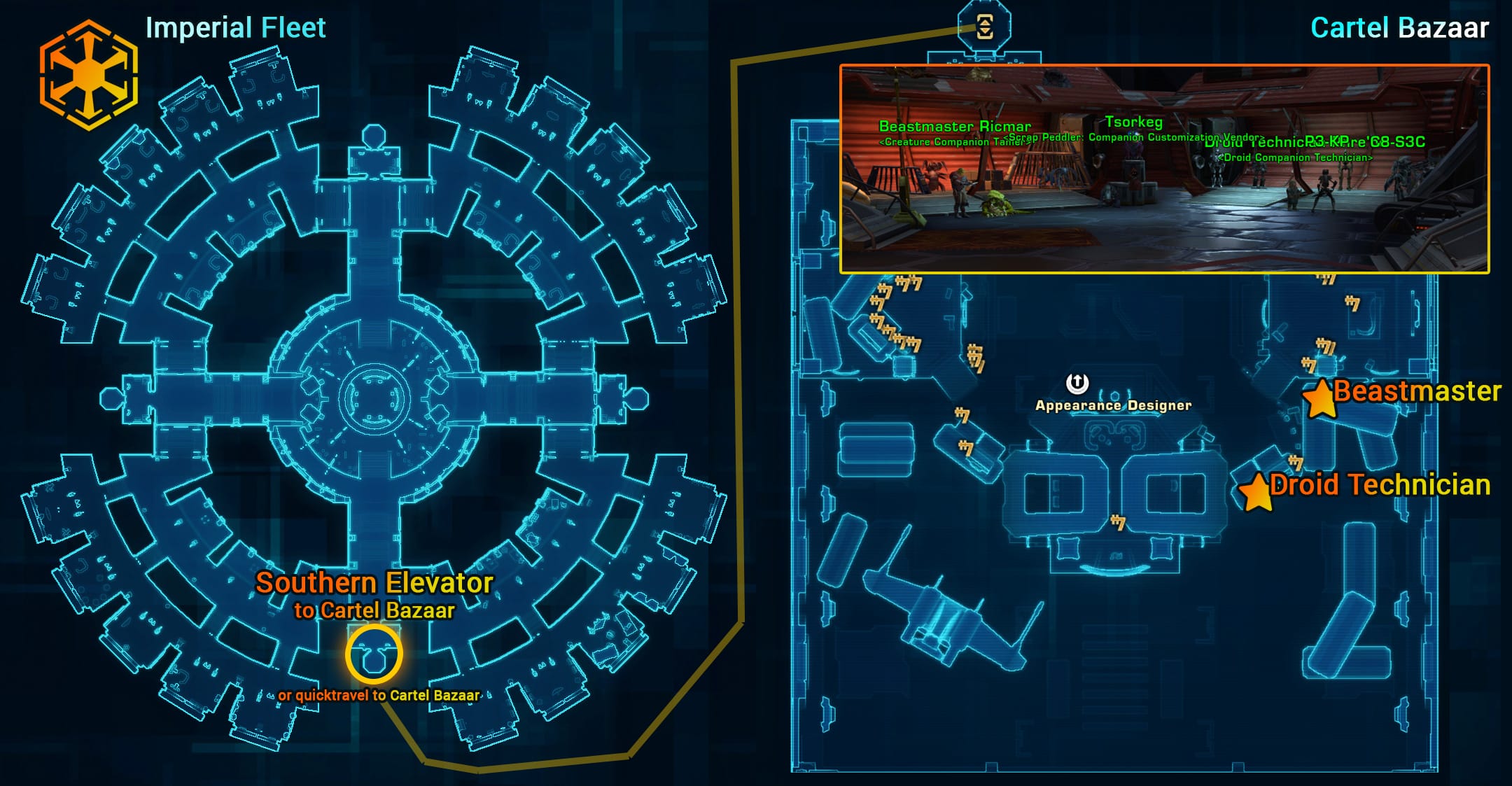 - The quest will have an icon beside it that will transport you to the Cartel Bazaar if you left-click it in your quest log. If it's not working, you can get to the Cartel Bazaar using the northern elevator on the Republic Fleet or the southern elevator in the Imperial Fleet.