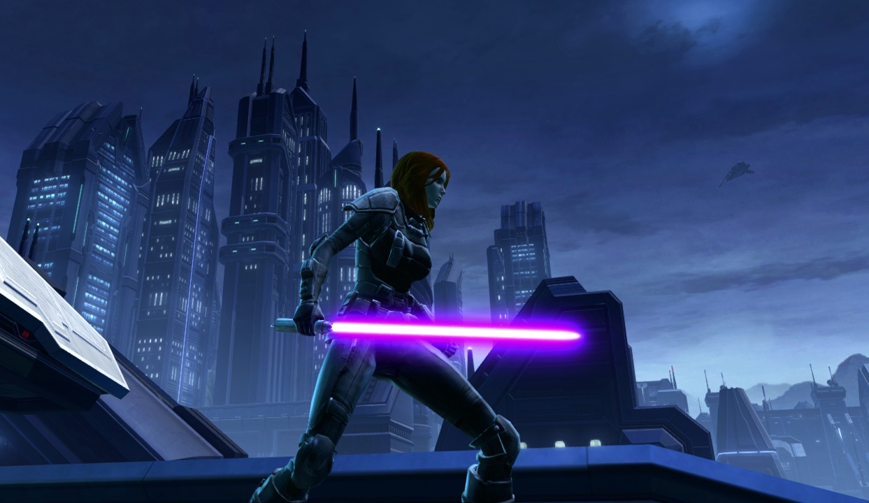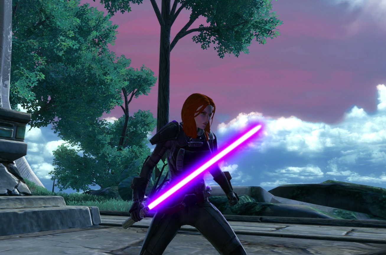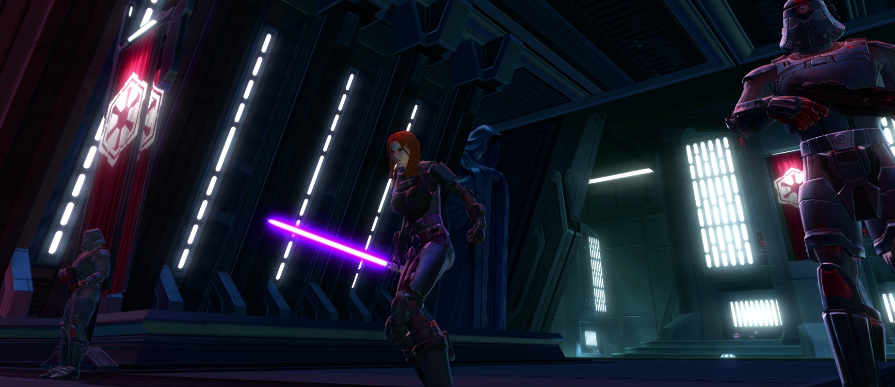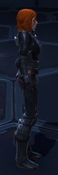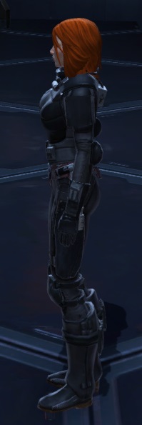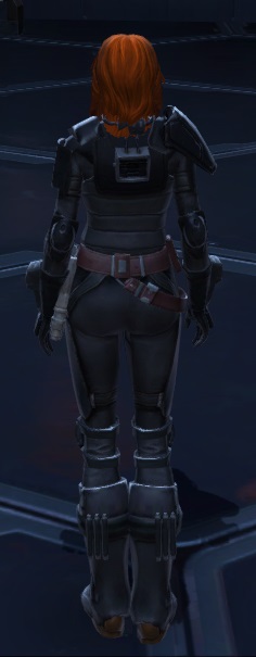 This character and outfit are inspired by Mara Jade’s appearance as the Emperor’s Hand in the “Choices of One” novel. While maintaining her clandestine appearance, this look is a departure from the iconic catsuit in which Mara Jade is typically depicted, instead opting for a more padded, utilitarian design. The majority of this outfit is from the Remnant Resurrected Agent set, the only changes being the Elegant Duelist’s Belt and the Remnant Arkanian Smuggler’s Boots. Along with her purple lightsaber blade, Daara Jem is ready to carry out the Sith Emperor’s will.