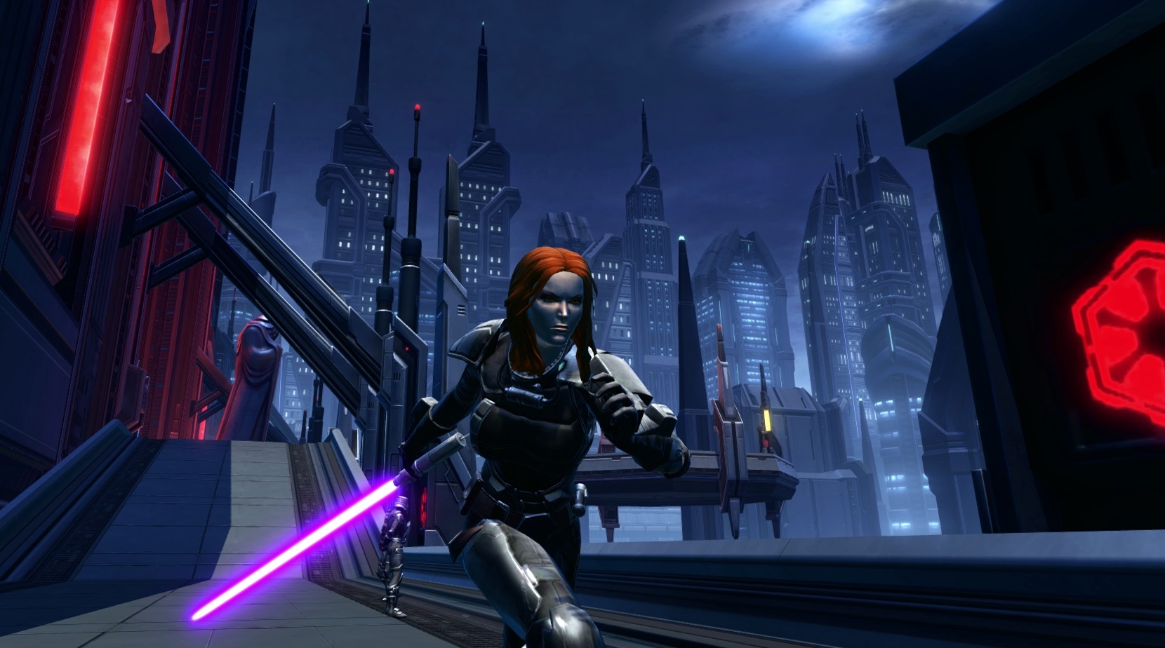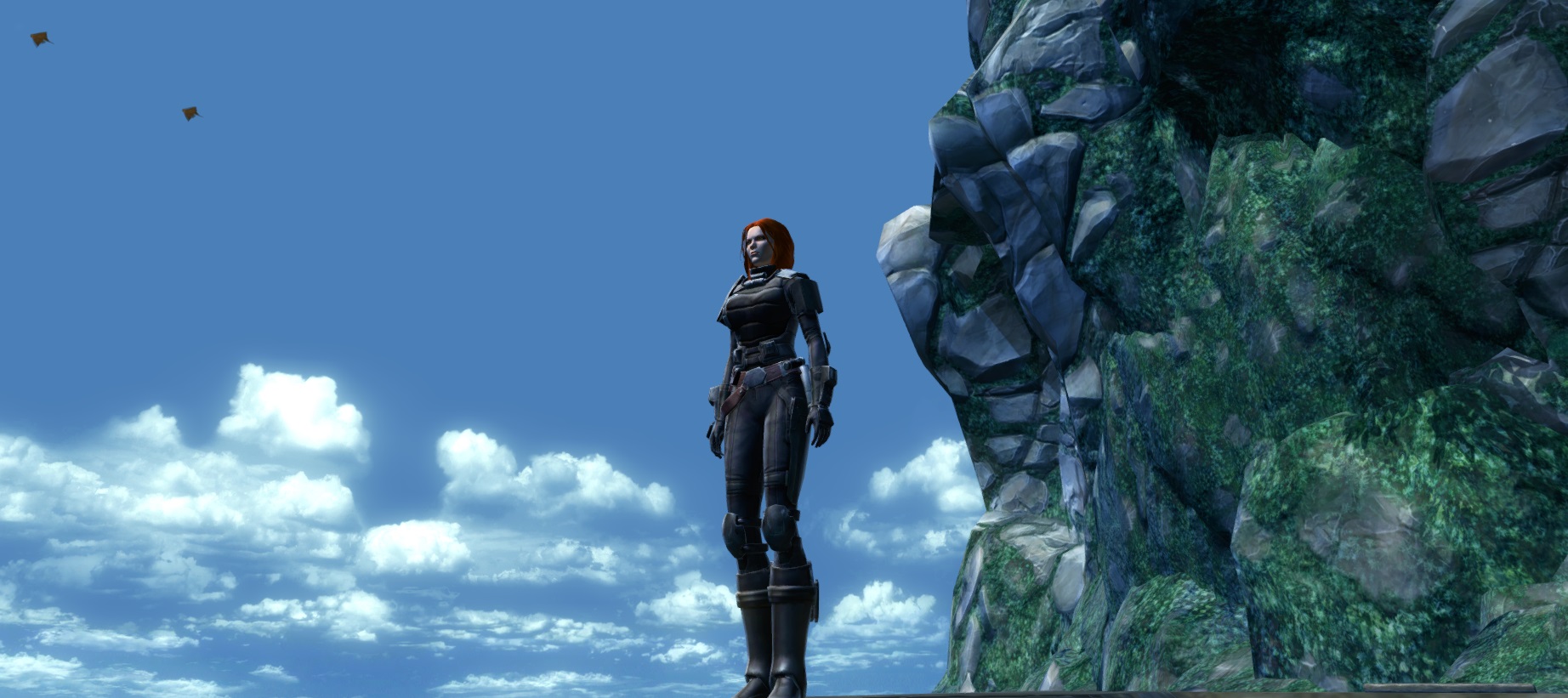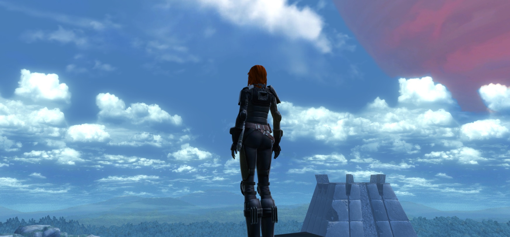 This character and outfit are inspired by Mara Jade’s appearance as the Emperor’s Hand in the “Choices of One” novel. While maintaining her clandestine appearance, this look is a departure from the iconic catsuit in which Mara Jade is typically depicted, instead opting for a more padded, utilitarian design. The majority of this outfit is from the Remnant Resurrected Agent set, the only changes being the Elegant Duelist’s Belt and the Remnant Arkanian Smuggler’s Boots. Along with her purple lightsaber blade, Daara Jem is ready to carry out the Sith Emperor’s will.