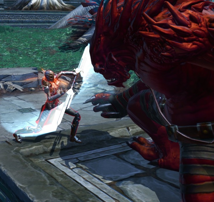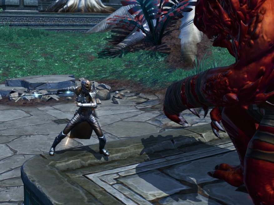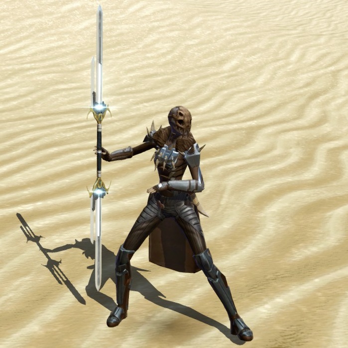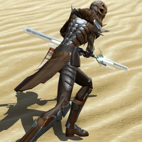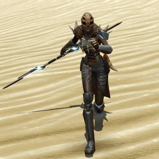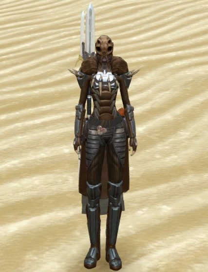Outfit: One of my early outfitting ambitions was to create a "hunting" Cathar that looked very animalistic and wielded either of the Cathar weapons available in the Cartel Market. I had originally planned on using the Satele Shan boots but after years of waiting and watching the price only go up even more, I settled for the placeholder boots I had. Another aesthetic goal was to maintain an overall "segmented armor" appearance, which is the reason for the choice of gloves and pants.
