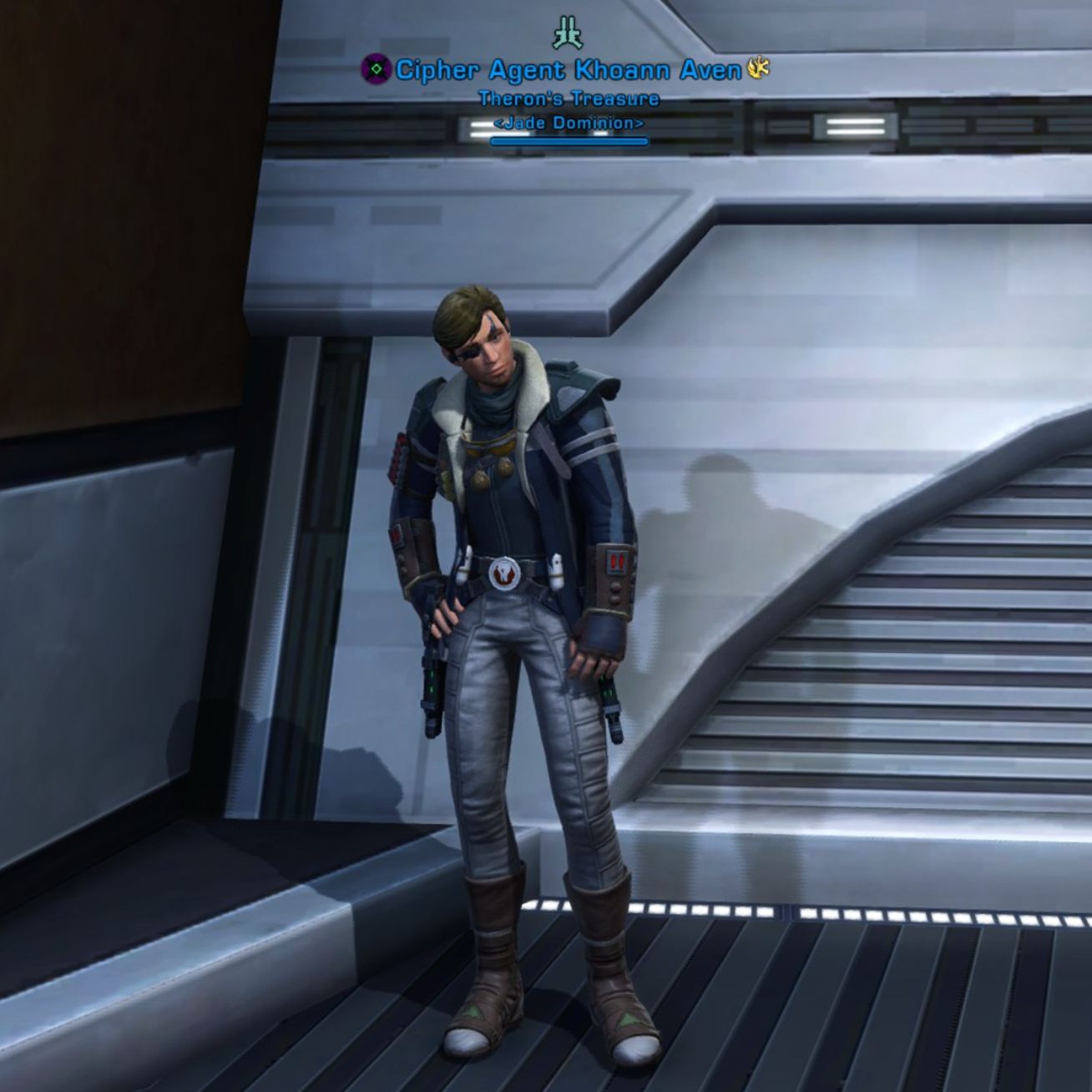 Chest is War-Forged Onslaught Jacket MK-2, kinda a mouthful lmao but i think i remember just buying it on the GNT???? anyway Khoanns whole deal is that he transferred to imperial intelligence after his brother was killed by the sith they where both serving under, and then following the Imperial Agent story, eventually decided he hated the empire and became a double agent for the republic!!!!!These are the pieces that c1pherixx said made up their outfit, SIS agent. Click the links to learn more about each piece!