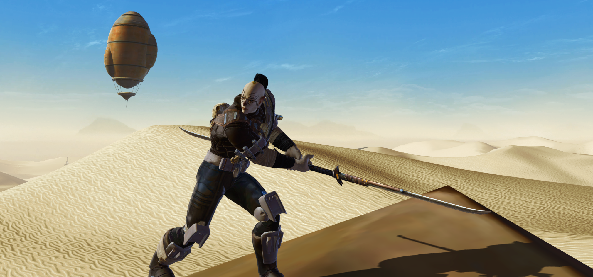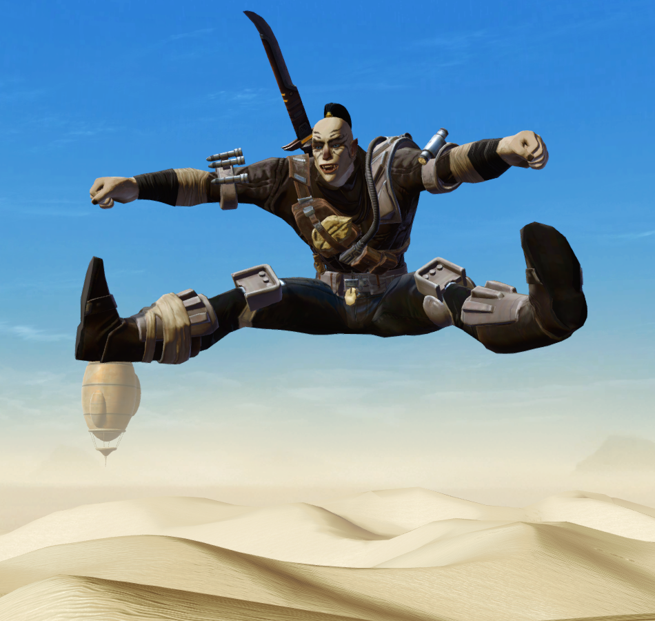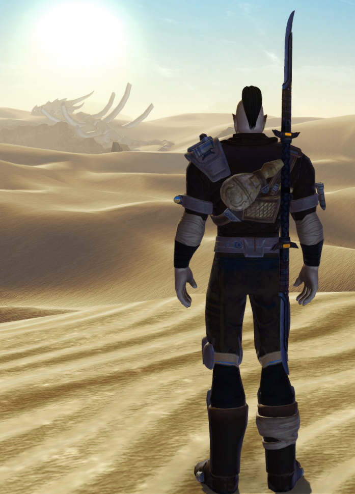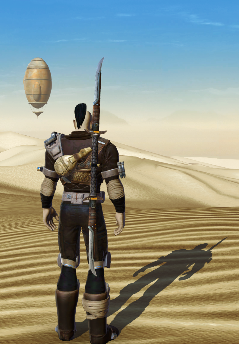 An old-school warrior monk, Oedipus wanders the land seeking ancient relics and learning the secrets of the cosmos. He braves dangerous environments, investigates alien technologies and brings the pain to dangerous monsters, all while placating the Jedi Council and ignoring his annoying girlfriend Nadia. That's what you get for dating a much younger woman, he tells himself. She's nice, sure, but I don't need constant bulletins on how much she learned from a slicing mission. Still, a commitment's a commitment. But I'm really married to the desert.