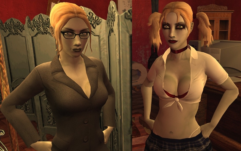 This my tribute to the Voerman ‘sisters’ in Vampire the Masquerade – Bloodlines. (If you have not played the game, I strongly urge you to check it out on Steam or GOG.) The look is mostly inspired by Jeanette, minus the Catholic school-girl attire.