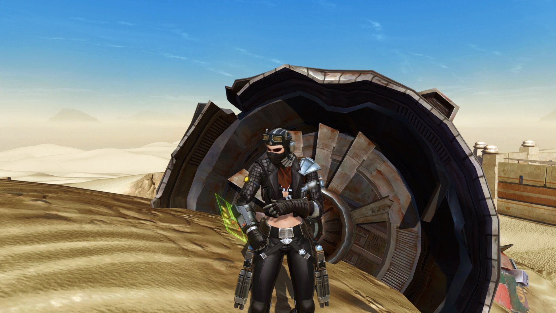 After the release of the Bold Hellion armor set I loved it so much I decided to make a biker look, without taking away the mercenary element. Wanted it to appear functional, specially with gloves because they are thick with controls on her right forearm (several skills include using these). Also the belt, with three bags and two straps for the heavy blasters. Type 3 body was essential for the tough appereance I was looking for. Hope you like it