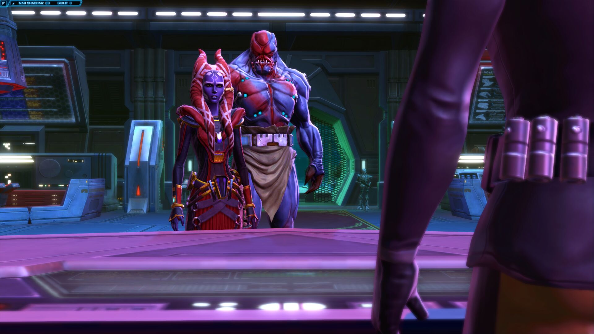 A gear set that i made up with the thoughts of showing the affluence and power that a Sith would demonstrate, i quite like Red and Gold colour scheme with a few purple hightlights to go with her skin colour