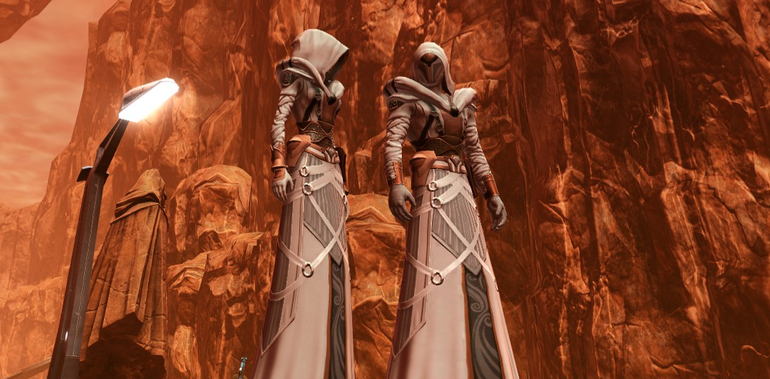 These are the pieces that Helle said made up their outfit, Sith Spouses: White Executioner (Lady). Click the links to learn more about each piece!