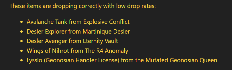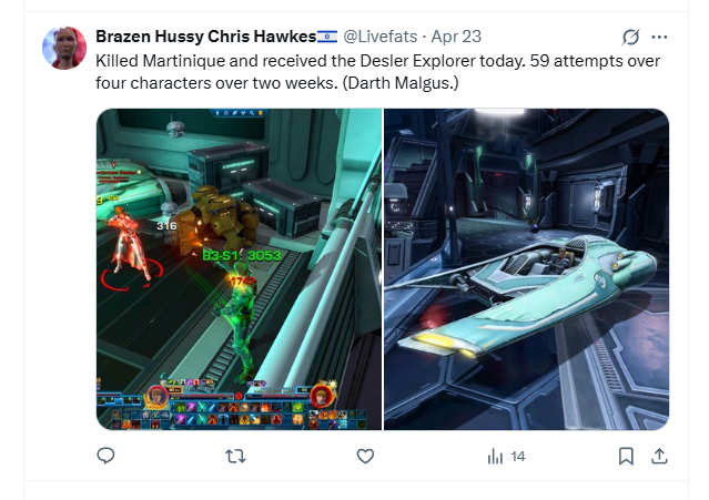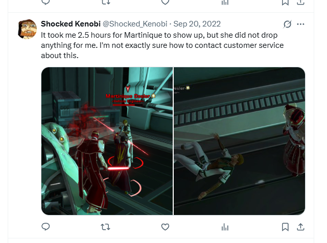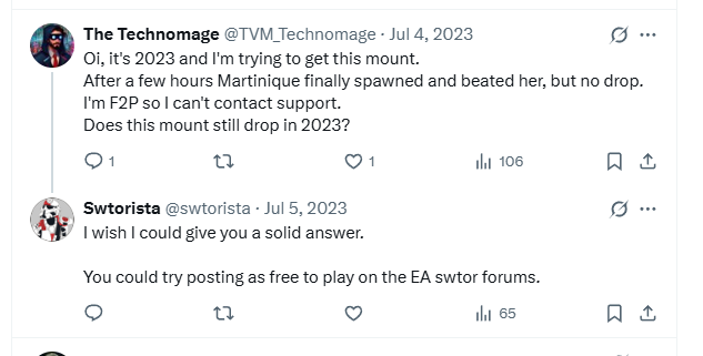 swtorista [June 26, 2025]: But, the developers replied to a post about rare items in 2024, These items are dropping correctly with low drop rates: Desler Explorer from Martinique Desler I am unsure if this means that even if you find Martinique, the mount dropping from her even if you find her is a low drop rate. [link]