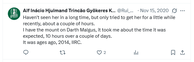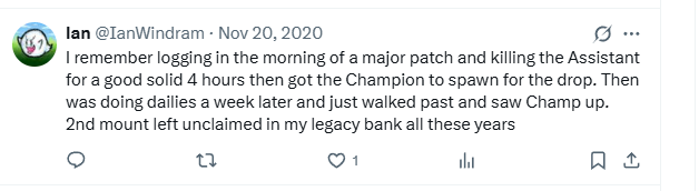 nickypityu [October 5, 2025]: I got the mount today! I was parking my assassin in that spot and randomly logged in every now and then between story missions and stuff (takes 15 minutes for the Assistant to respawn) and finally like 3 minutes ago the champion was there and dropped the mount! Been doing this for like 1 month so I'd say I got lucky to get it so quick!