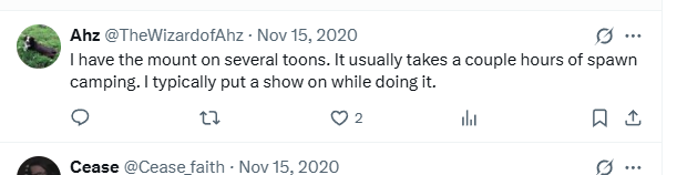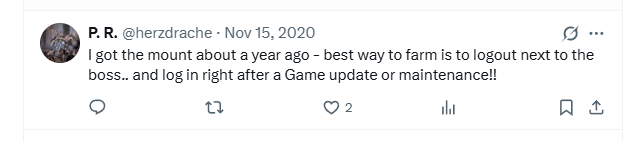 jr_revolution [June 26, 2025]: fyi, for ANYTHING that you need to repeatedly kill an enemy or mob (like desler and the acolyte of fear for the "mickey ears" on oricon), there is a grind exploitation prevention mechanic. there's no hard rule and seems like it's dependent on the enemy and area. but if you kill something in the same area repeatedly, either no loot drops or you won't be able to get the loot (also, you won't get xp due to people farming certain areas for xp). so the way to farm this mount is to kill it prob 3 times, then swap toons. not sure if swapping instances will help, but I wouldn't want to test it out just in case.