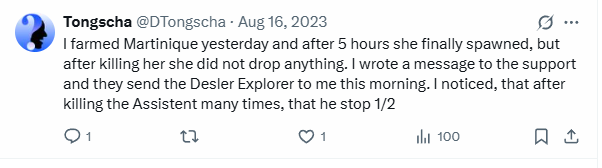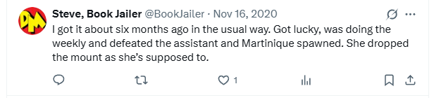 Multiple players also reported that they did successfully find and defeat Martinique Desler the special NPC, but once defeated, she did not drop the special mount and they contacted customer service, and that customer service sent them the mount in the mail and that it was a known bug. Player David suggests that you may need these things to provide proof, so maybe keep your screenshot key handy while fighting Martinique! Send these along with your report: