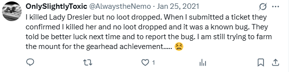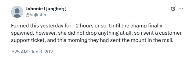 rogue.two [June 26, 2025]: July 24, 2023. Killed the boss, didn't get the drop. Wrote to Customer Service and they confirmed everything based on my screenshots and time stamps provided. They granted me the mount. I still have the email from support so that's how I know the exact date.
