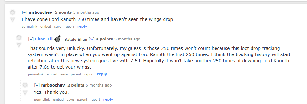 swtorista [June 26, 2025]: The Wings of Nihrot I believe were the first item to have the 'bad luck prevention' attached to them, increasing your chance of getting them ever so slightly very time you run the content attached to them. ' When you collect loot from sources we check the incoming item to see if it is one of the bad luck protected items. If it is not, we increase our counter that you have completed a run and not received the protected item. After a set number of attempts, we make sure one of the protected items is rewarded.' [link]