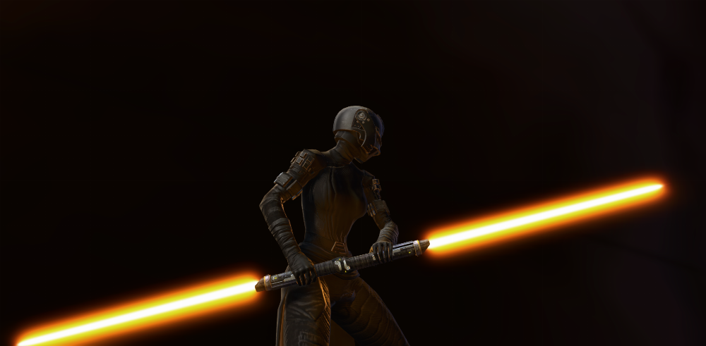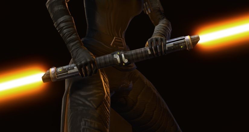 The Defiant Saberstaff MK-1 is a Retired Endgame Defiant double bladed lightsaber that can be found in Star Wars: The Old Republic. The Defiant Saberstaff MK-1 can only be used at a specific level and up, but if you are higher than the weapon's required level, you can wear it cosmetically in the Outfitter to show its appearance on your character while using a higher-level weapon in your Gear tab for stats.