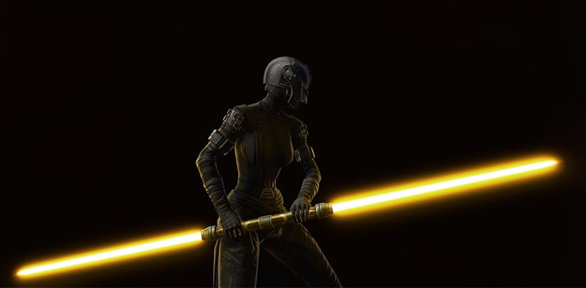 The Jaesa's Jedi Knight Dualsaber is a Companion Alliance double bladed lightsaber that can be found in Star Wars: The Old Republic. The Jaesa's Jedi Knight Dualsaber can only be used at a specific level and up, but if you are higher than the weapon's required level, you can wear it cosmetically in the Outfitter to show its appearance on your character while using a higher-level weapon in your Gear tab for stats.