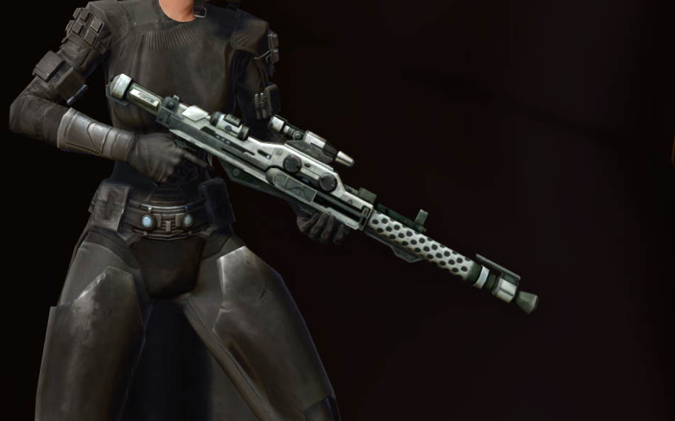 The R-405 Elite Stealth Enforcer is a Retired Quest Rewards Unique blaster rifle that can be found in Star Wars: The Old Republic. The R-405 Elite Stealth Enforcer can only be used at a specific level and up, but if you are higher than the weapon's required level, you can wear it cosmetically in the Outfitter to show its appearance on your character while using a higher-level weapon in your Gear tab for stats.
