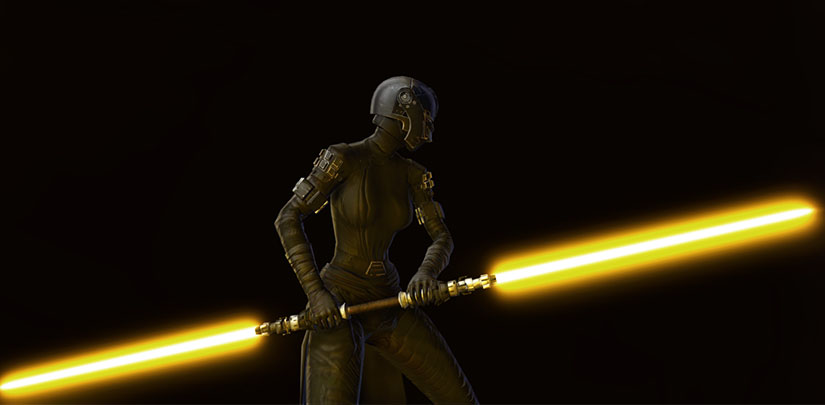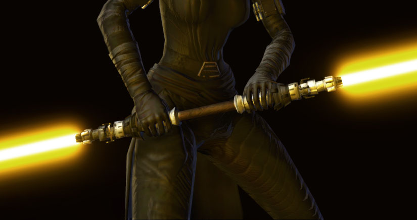 The Rakata Duelist's Saberstaff is a Gearing Rakata double bladed lightsaber that can be found in Star Wars: The Old Republic. The Rakata Duelist's Saberstaff can be worn at any level in the Outfitter - it's a cosmetic weapon, and has no stats attached to it.