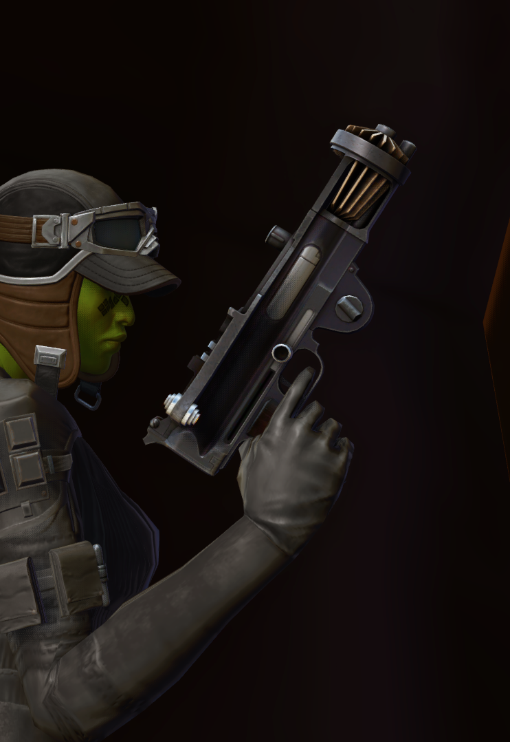 The Retired Gladiator Blaster Pistol is a Cartel blaster pistol that can be found in Star Wars: The Old Republic. The Retired Gladiator Blaster Pistol can be worn at any level in the Outfitter - it's a cosmetic weapon, and has no stats attached to it.