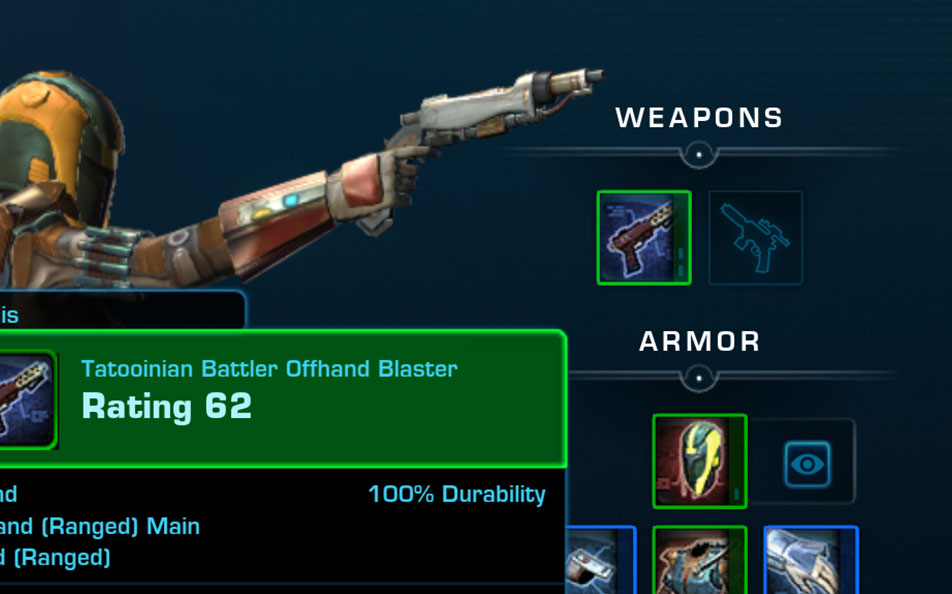 This is not a direct screenshot of the Tatooinian Battler Offhand Blaster. The file name is tatooinian-battler-offhand-blaster.jpg - as far as I can tell it is identical to another weapon, so I re-used the screenshots. There may be small variations that I could not tell apart when comparing thumbnails, previews or item icons.