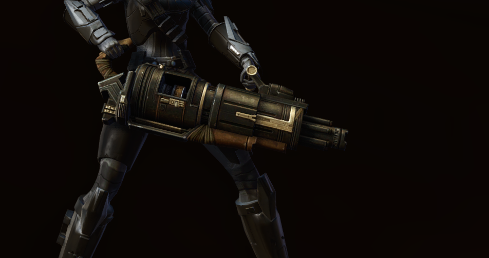 The Thyrsian Assault Cannon is a Gearing Thyrsian blaster cannon that can be found in Star Wars: The Old Republic. The Thyrsian Assault Cannon can be worn at any level in the Outfitter - it's a cosmetic weapon, and has no stats attached to it.