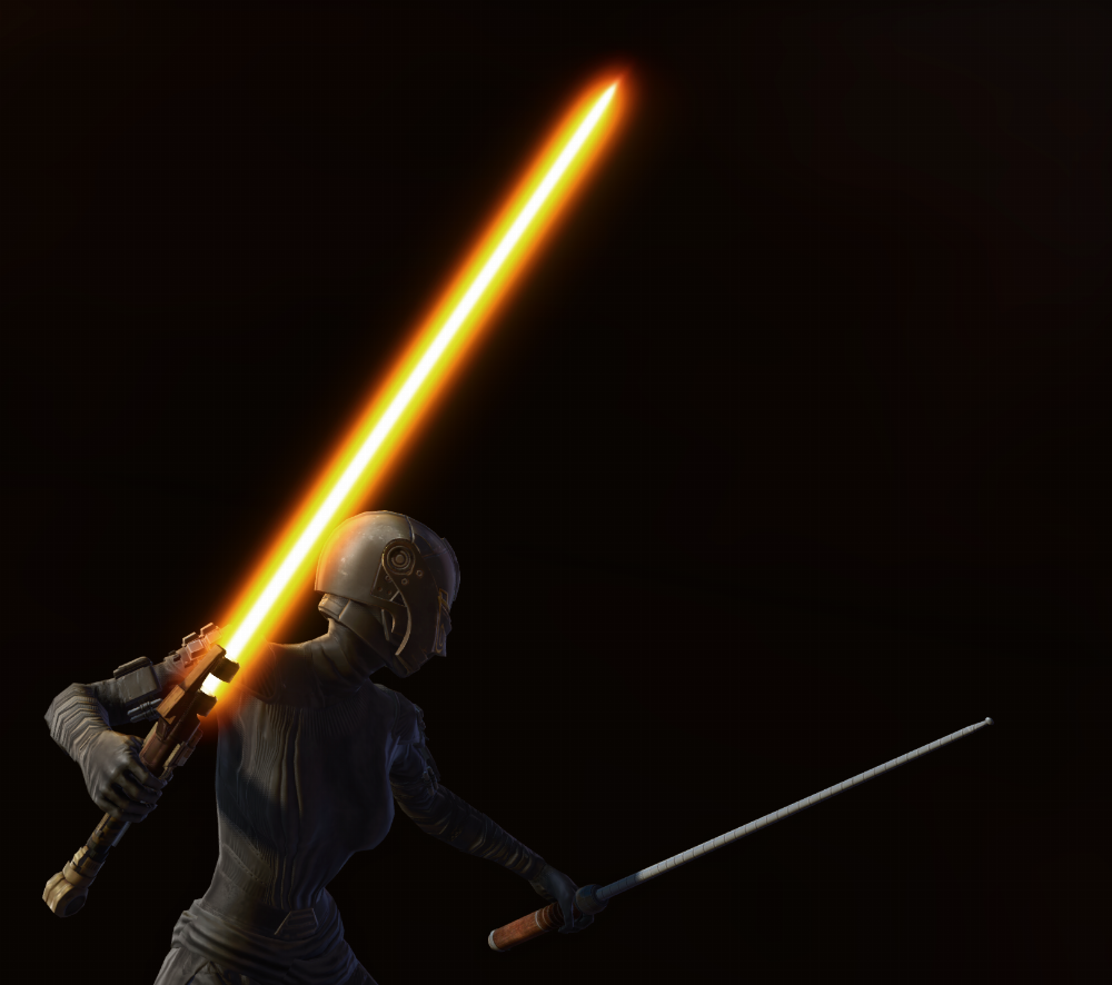 The Veteran Outlander Lightsaber is an Eternal Chapters Kotet Chapter 1 lightsaber that can be found in Star Wars: The Old Republic. The Veteran Outlander Lightsaber can only be used at a specific level and up, but if you are higher than the weapon's required level, you can wear it cosmetically in the Outfitter to show its appearance on your character while using a higher-level weapon in your Gear tab for stats.