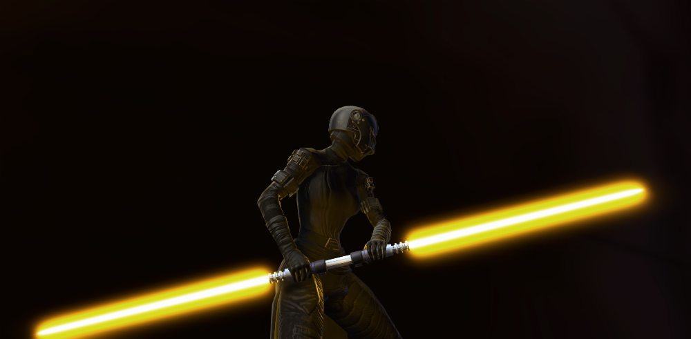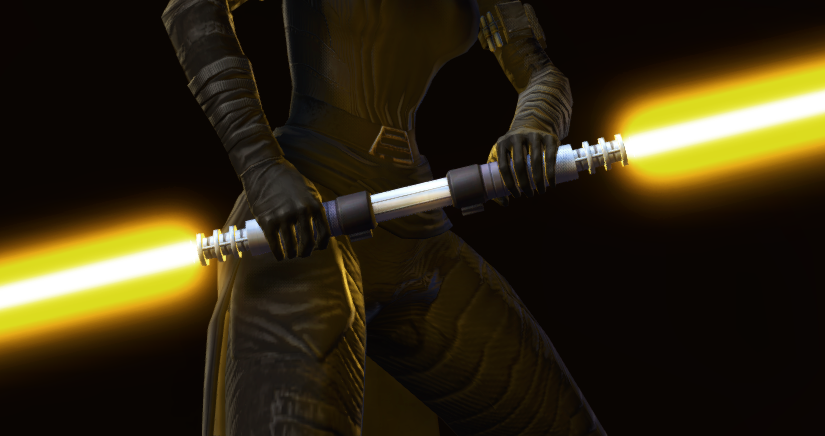 The Warmonger's Saberstaff is a Retired Flashpoint double bladed lightsaber that can be found in Star Wars: The Old Republic. The Warmonger's Saberstaff can only be used at a specific level and up, but if you are higher than the weapon's required level, you can wear it cosmetically in the Outfitter to show its appearance on your character while using a higher-level weapon in your Gear tab for stats.